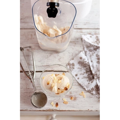 – Une cuve pleine qui se glisse à la place du bol à jus pour la préparation de délicieux sorbets à base de fruits congelés mais aussi des compotes fines et des purées homogènes.
