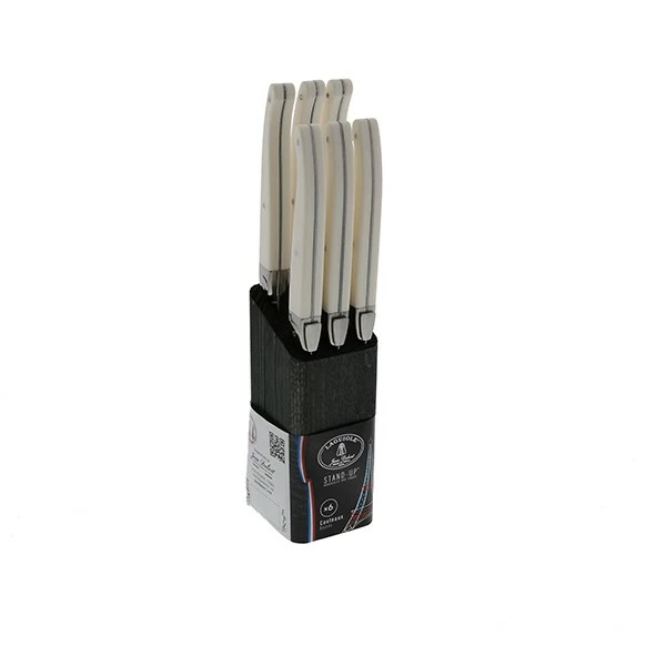 Le bloc en bois et ses 6 couteaux à steak Laguiole vous permettra d’avoir toujours à portée de main les couteaux que vous utilisez le plus au quotidien ! Son bloc moderne et robuste en bois teinté noir vous permettra d’ordonner votre cuisine et notamment vos couteaux pour vos repas de tous les jours. Résistant, ces couteaux comporte une lame en inox pleine soie micro dentée d’une épaisseur d’1,2 cm ! Manche ABS blanc moderne au design sobre et épuré. En prime, vos couteaux comporte une tranche leur permettant de tenir debout pour un effet futuriste sur vos tablées.