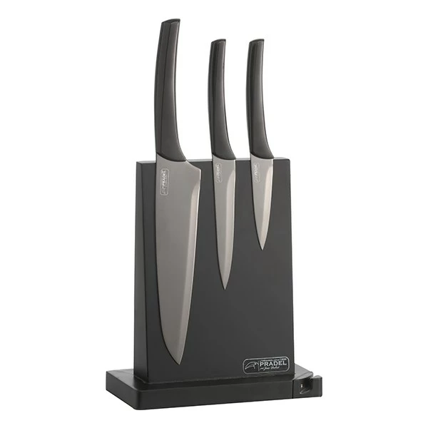 Le bloc est livré avec trois couteaux indispensables au quotidien: un couteau Office doté d’une lame de 9 cm; un couteau multi-usages de 13 cm et un couteau Chef avec une lame de 20 cm. Les lames sont pleine soie avec un manche en titane à la finition ABS qui assure une bonne prise en main.
