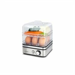 Dans ce cuiseur transparent avec la base en inox, vous pourrez cuire jusqu’à 8 œufs et une grande quantité de légumes grâce à ses deux plateaux superposés. Le cuiseur possède une contrôle électronique du temps de cuisson qui permet de programmer l’arrêt pour une cuisson parfaite ! Les plaques ont un revêtement antiadhérent, le support à oeufs est amovible et la machine est livrée avec un mesureur et perce-oeufs. Un signal sonore vous indique quand la cuisson est terminée.