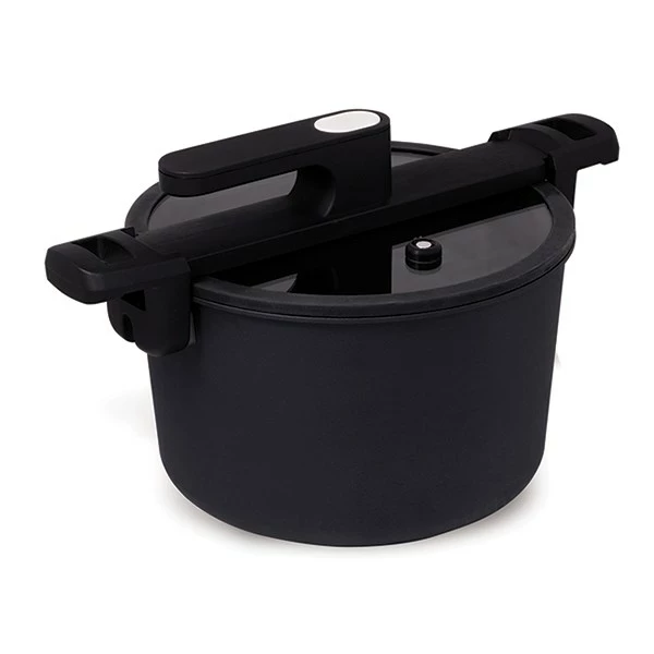 Avec ce cuiseur basse pression noir 6 L, vous pourrez cuire sainement tous vos légumes, viandes, poissons, fruits de mer, riz, oeufs et pâtes. Avec son intérieur anti-adhérent, il résiste aux rayures et à l’abrasion pour des aliments qui n’accrochent pas. Son couvercle en verre conserve la chaleur longtemps tout en vous laissant la possibilité de surveiller vos préparations. Avec son contour en silicone, il est très étanche et n’abîme pas les contours de votre cuiseur. Pour une prise en main en toute sécurité, il est équipé d’une poignée en bakélite noir. En fonte d’aluminium, il est très résistant et vous pourrez cuisiner de grandes quantités grâce à sa capacité de 6 L.