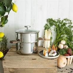 Au-dessus se place un cuit vapeur tout inox, avec des poignées amovibles en bois d’olivier, qui assurent une excellente prise en main.