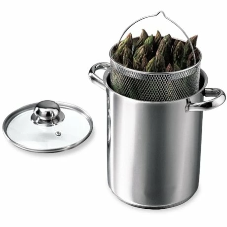 Le cuit-asperges 2 en 1 vous permet de cuire vos asperges sans les réduire en bouillie. Rangées à la verticale dans le panier amovible, elles cuisent sans s’écraser et s’égouttent facilement. Doté d’un couvercle en verre, le cuit-asperges s’utilise aussi pour la cuisson des pâtes, du riz ou de vos légumes. En inox avec triple fond, le cuit-asperges 2 en 1 assure une répartition homogène de la chaleur (et passe sur tous types de feux). Il est livré avec son couvercle en verre et son panier en fil d’acier étamé.