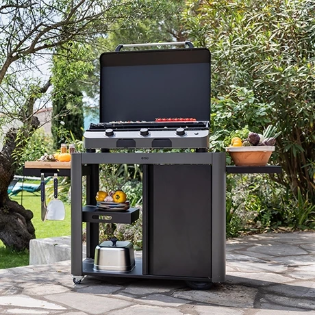 Le couvercle Fusion 75 noir est complémentaire de la plancha au gaz 3 bruleurs Fusion 75 gris cargo de la marque Eno. Ce capot a un double usage : il permet de couvrir votre plancha pour protéger votre plaque en fonte émaillée lors de l’hivernage. Pratique et efficace, il garde aussi votre plancha propre entre chaque utilisation en été. Fabriqué en France en acier galvanisé thermolaqué noir, il résiste aux intempéries et aux UV lorsqu’il reste en extérieur. La poignée ergonomique est en aluminium.