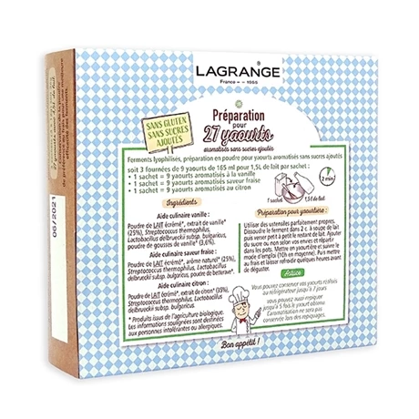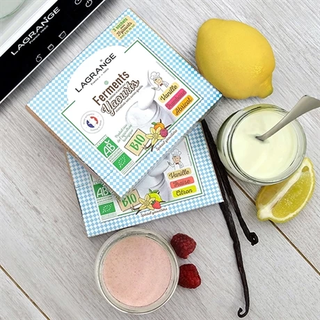 Réalisez vous-même vos yaourts, à l’aide du ferment aromatisé Vanille, Fraise, Citron Lagrange. Faites vos yaourts maison sans avoir besoin de yaourt industriel. L’étui contient 3 sachets d’aromatisation (Vanille, Fraise, Citron) issus de l’agriculture biologique.