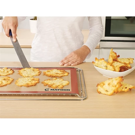 Le tapis de cuisson professionnel en silicone et fibre de verre Mathon est antiadhérent et permet une cuisson saine sans ajout de matière grasse. Réutilisable et facile à entretenir, ce tapis flexible ne garde ni goût ni odeurs. Il est compatible avec le four jusqu’à 240°C et convient aussi bien pour des préparations sucrées de type biscuits, gâteaux et macarons que pour des feuilletés ou amuse-bouches salés.