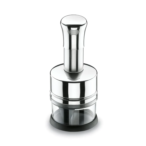 Pratique et compact, ce hachoir à piston oignons et petits légumes est conçu en inox résistant. Pour l’utiliser, il suffit de le remplir d’aliments à hacher (oignons, ail, fines herbes…) puis d’appuyer : la lame tourne d’un quart de tour à chaque pression, entraînant avec elle les différents aliments pour les broyer finement. Cet ustensile se démonte entièrement pour un lavage facile à la main.