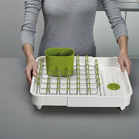 L’égouttoir extensible blanc Extend™ de Joseph Joseph vous permet d’augmenter facilement et rapidement votre espace pour égoutter votre vaisselle. Sa taille peut presque doubler si besoin pour égoutter la vaisselle d’une seule personne ou bien de toute une famille. Un bec verseur intégré évacue l’eau en excédent, mais celui-ci peut être fermé et rangé pour retenir l’eau.