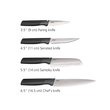 Le set comprend 4 couteaux : un couteau d’office de 9 cm, un couteau de chef de 16,5 cm, un couteau dentelé de 11 cm et un couteau santoku de 14 cm. Après utilisation, il est recommandé de laver vos couteaux à la main et de les sécher immédiatement.