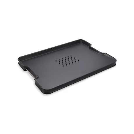 La planche à découper noire Cut&Carve de Joseph Joseph est une planche multifonction double face possédant une surface de découpe inclinée ainsi qu’une assise centrale antidérapante pour faciliter la découpe de la viande ! Grâce à ces petits picots centraux, votre viande est maintenue lorsque vous la tranchez. Ce côté de la planche incliné est doté de bords hauts pour récupérer le jus et ne pas salir votre plan de travail. Ingénieuse, cette planche dispose de coins conçus pour verser aisément le contenu et récupérer les jus de viande pour en faire des sauces en toute simplicité.
