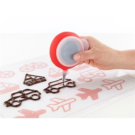 Son utilisation est très simple : il suffit de faire chauffer du chocolat, de placer le patron sous le tapis transparent, de dessiner la forme souhaitée sur le tapis avec le Decopen. Après complet refroidissement au réfrigérateur, les décorations se détachent du tapis et décorent les gâteaux.