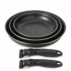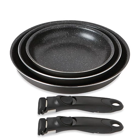 Ce set de 3 poêles 20, 24 et 28 cm Effet Pierre vous permet d’avoir à votre disposition toutes les poêles nécessaires dans votre cuisine avec un encombrement réduit au maximum : le manche est amovible et se clipse d’un seul geste sur chacune de vos poêles ! Ainsi, leur rangement est beaucoup plus facile dans vos placards sans réduire la maniabilité : le « clipsage » du manche s’adapte parfaitement à chaque ustensile et le tient fermement pour assurer une manipulation facile en toute sécurité.