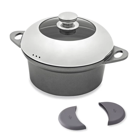 Attention : Poignées conductrices de chaleur, afin d’éviter toute brûlure nous vous recommandons fortement d’utiliser des maniques lorsque vous saisissez le faitout. Vous trouverez dans ce lot le faitout vendu avec ses maniques. Le set de 2 maniques grises en silicone va vous permettre d’atténuer fortement la chaleur transmise par les poignées en saisissant votre faitout ! Dotées d’une forme ergonomique, elles sont conçues pour se glisser autour des poignées de faitouts. En silicone souple, elles seront résistantes et durables.