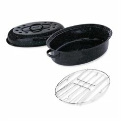 En céramique Graniteware, le roaster vous permet de cuire, sur la flamme ou au four, vos rôtis et volailles. Son couvercle à picot assure un arrosage permanent des aliments, pour un résultat moelleux et savoureux. Il est idéal pour cuire vos rôtis, dorades jusqu’à 3,5 kg. Roaster made in USA.