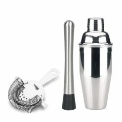 Le lot shaker et ses accessoires comprend un shaker à cocktail ainsi que ses accessoires, une passoire et un pilon à cocktail.