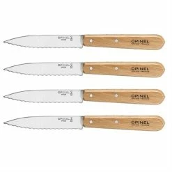 Ce set de 4 couteaux office lames crantées inox 10 cm couleur naturel comporte 4 petits couteaux polyvalents indispensables pour découper, trancher précisément les fruits, tomates, saucissons, … Leur lame de 10 cm en acier inoxydable Sandvik mis au point pour Opinel est réputée pour son tranchant et sa facilité d’entretien. En hêtre issu d’exploitations françaises, le manche est dur et résistant. Recouvert d’une couche de vernis, il est protégé contre l’humidité et les salissures.