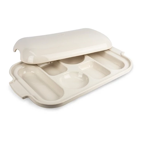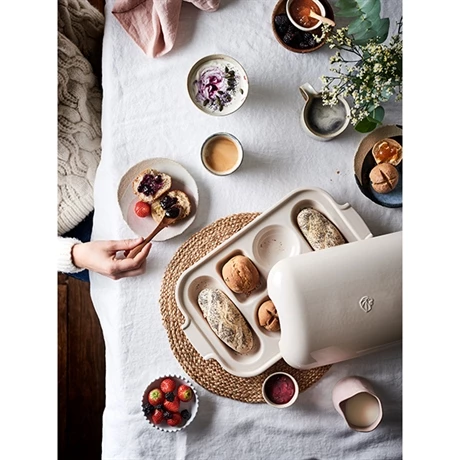 Cette plaque boulangère écru en céramique vous permettra de préparer en une seule fournée 2 mini-baguettes de 110 g, 2 mini-financiers de 70 g et 2 mini-boules de 70 g, pour une table de petit-déjeuner aussi belle que diversifiée. Une fois votre pâte préparée, confiez à votre plaque boulangère la cuisson de vos mini-pains : la pâte n’accroche pas, les évents et le couvercle non émaillé laissent s’évaporer juste ce qu’il faut d’humidité pour une croûte craquante et une mie délicieusement aérée, cuite à cœur.