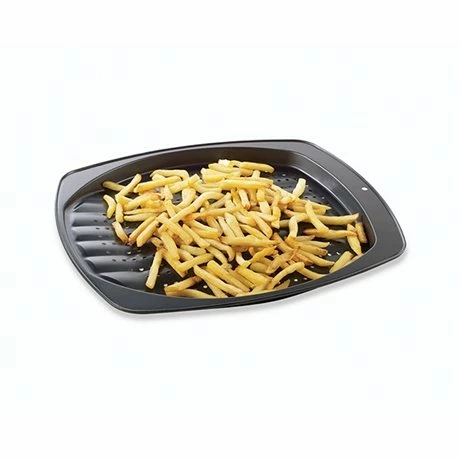 Ce plat à frites perforé précuit 39 cm est idéal pour la cuisson de vos frites au four. Etalez vos frites dessus et glissez le dans votre four… elles cuiront parfaitement grâce aux trous qui permettent de répartir la chaleur. Son revêtement anti-adhérent empêche aux frites de coller. En tôle d’acier, il est résistant et dure dans le temps.