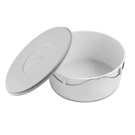 L’innovation de ce bol vient de sa forme ingénieuse qui permet en un tour de main de faire passer le pot d’une position basse de trempage pour la confection des spécialités laitières protéinés, à une position haute d’égouttage. Pratique, le bol offre une vision directe sur le niveau du petit lait grâce à son format transparent. Accompagné d’un bec verseur, le bol dévoue un égouttage du petit lait en toute simplicité dans l’évier.