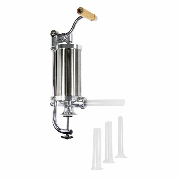 Le poussoir à saucisses manuel en inox vous servira à mettre en boyaux la chair à saucisse ou saucisson. Très pratique, la position verticale permet de le remplir. Ainsi, vous réaliserez facilement des saucisses maison ! Le poussoir à saucisse est livré avec 4 entonnoirs de 15, 19, 22 et 25 mm. D’une capacité de 1,5 L, vous ferez une bonne quantité de saucisses d’un coup. En inox, l’appareil est résistant.