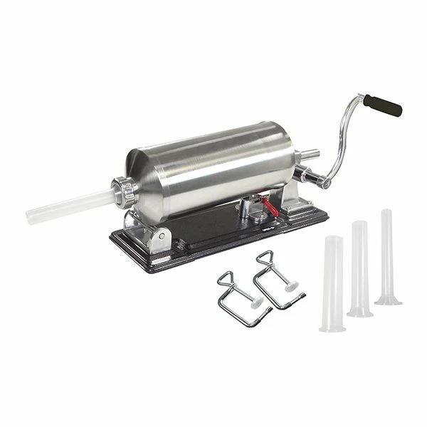 Le poussoir à saucisses manuel en inox vous servira à mettre en boyaux la chair à saucisse ou saucisson. Très pratique, vous pourrez le mettre en position vertical pour le remplir, puis en position horizontale pour la mise ne boyaux. Ainsi, vous réaliserez facilement des saucisses maison ! Le poussoir à saucisse est livré avec 4 entonnoirs de 17, 21, 25 et 29 mm. D’une capacité de 3,5 L, vous ferez une grande quantité de saucisses d’un coup. En inox, l’appareil est résistant.