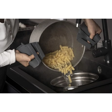 Polyvalente, cette manique Grippy s’adaptant parfaitement à la forme de votre main et sécurisant votre préhension des objets est souple. Le retour protège le bout de vos doigts et les lanières situées de part et d’autre maintiennent vos doigts pour éviter qu’ils ne glissent. La prise en main des aliments et ustensiles est ergonomique et vous protège de tous les risques en cuisine.
