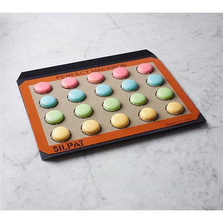 Grâce à ses 20 empreintes, la toile de cuisson pour macarons Silpat 42 x 29,5 cm permet de confectionner facilement des coques de macarons régulières, du même diamètre, pour des présentations dignes des pâtisseries professionnelles.