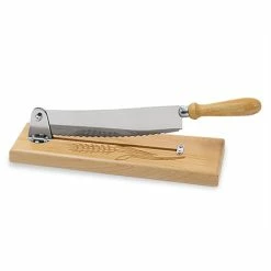 Son socle est en bois blanc avec décor épi. La lame de 25 cm est en inox.